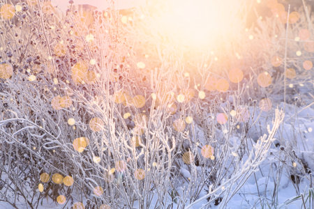 Delicate frosted branches and snow with soft bokeh lights create a magical winter scene.