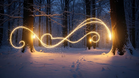 A surreal and magical scene unfolds in a snowy forest at night. Tall, dark tree trunks stand like sentinels, dusted with snow. A luminous, wavy line of golden light, resembling energy or magic, flows horizontally through the center of the frame, casting a warm glow. The background is a soft blur of blue and white, with scattered bokeh lights suggesting more distant illumination. Snowflakes are visible, adding to the wintry atmosphere. The overall mood is mysterious, and dreamlike.
