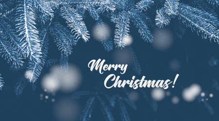 Spruce branches and text Merry Christmas! on a dark background