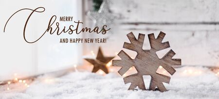 Scandinavian styled christmas background - a big wooden snowflake on a bright white snowy scene beside a window / greeting card text