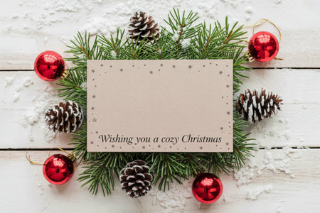 A flat lay image showcasing a Christmas card surrounded by pine branches, pine cones dusted with snow, and red ornaments on a white wooden background.