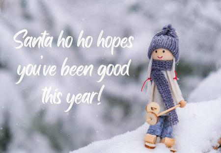 Santa ho ho hopes you have been good this year Inspiration joke quote phrase Angel gnome in scarf and knitted hat skiing on snowy fir branch Elf toy on skis in snowy landscape New year and Merry Christmas greeting card. Winter Holidays resort