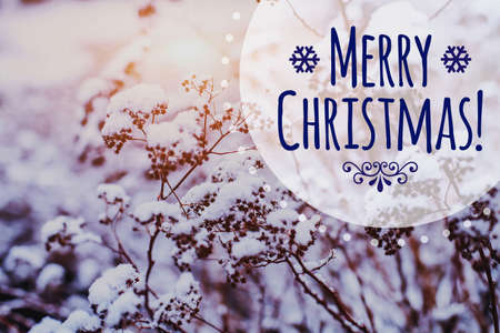 Merry Christmas greeting card on beautiful winter frozen landscape background with copy space