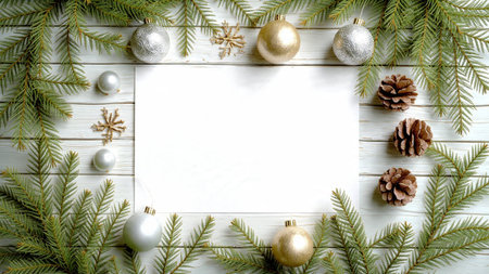 Christmas greeting card mockup with fir tree branches, pine cones and decorations on white background