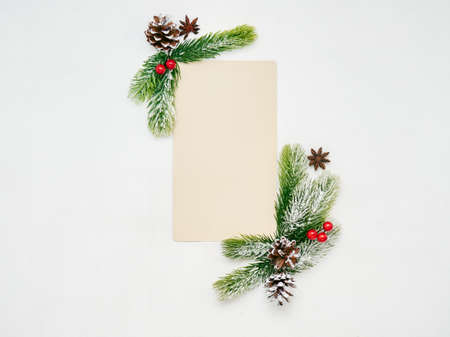 Christmas tree branches with paper card note. flat lay. Nature New Year concept.