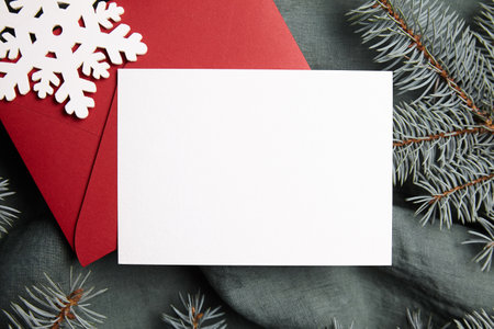 Christmas 5x7 card mockup template with envelop on natural fir twigs background. Design element for Christmas and New Year congratulation, rsvp, thank you, greeting or invitation card
