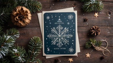 Christmas greeting card with snowflakes and fir branches on wooden background
