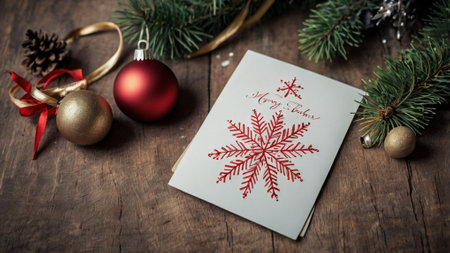 Christmas greeting card with christmas decorations on rustic wooden background.
