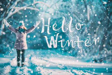 Woman in winter park with text Hello Winter