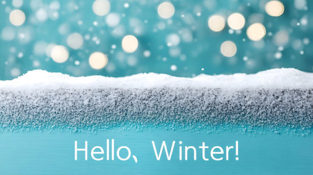 Hello winter text on snowy frosted background with bokeh lights, creative festive design for calendar.