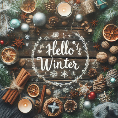 Hello Winter lettering with hot chocolatehmallows and christmas decorations