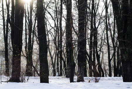 Trees and branches covered with snow and hoarfrost in a city park in the morning in cloudy weather. Winter season, january. For design.