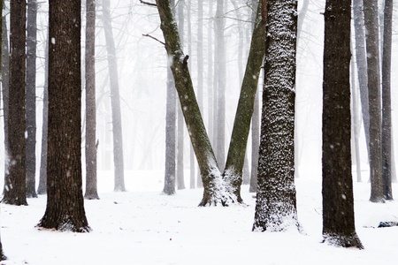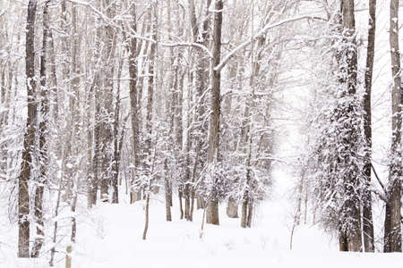 Winter snow storm in a forest with wind blowing the snowflakes through the trees