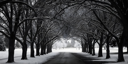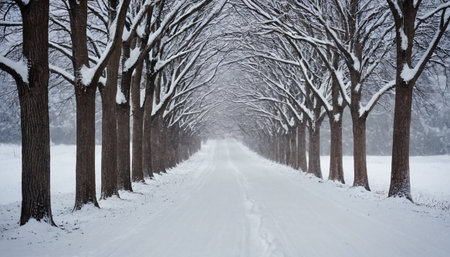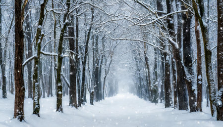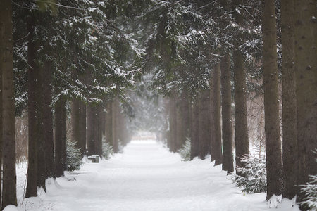 Frost-covered showing tire tracks lead down a snowy park path lined with frost covered trees keywords: winter, snow,...