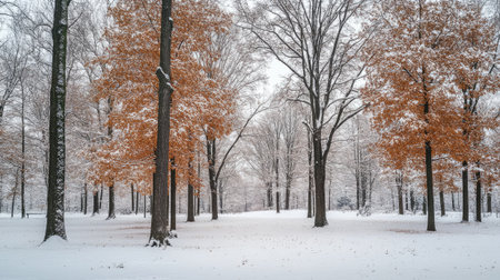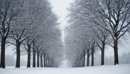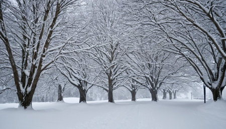 A tranquil winter park scene unfolds with a snow-covered path winding through a collection of bare deciduous trees under a soft, diffused light.