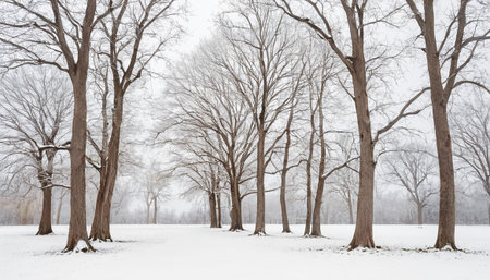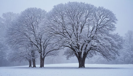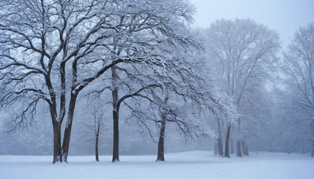 Several large deciduous trees with bare branches heavily dusted with snow stand in a flat, snow-covered field. The background is a soft, hazy grey,...