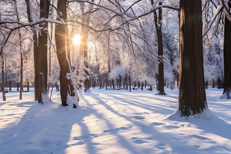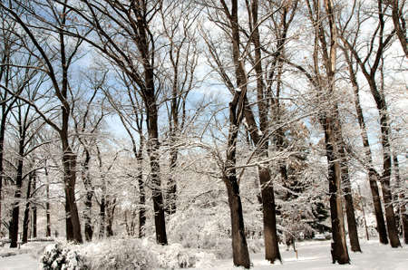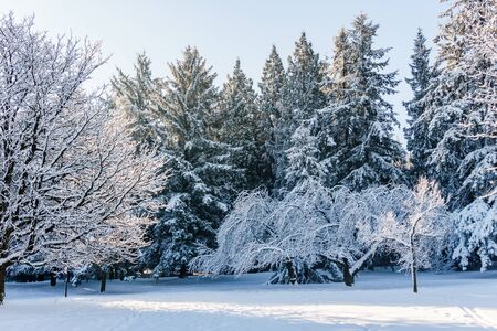 Winter landscape with trees covered with snow in the park. Beautiful winter landscape