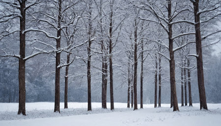 A blanket of snow covering the trees in a quiet forest, the soft winter light casting long shadows on the ground.