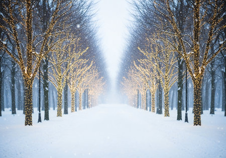 A serene winter forest scene bathed in soft, warm light. Tall trees are heavily laden with frost and snow, their branches adorned with numerous glowing golden orbs and delicate, swirling light trails. The background is softly diffused, creating a dreamlike and atmosphere. The overall mood is peaceful, magical, and whimsical, evoking a sense of wonder and tranquility.