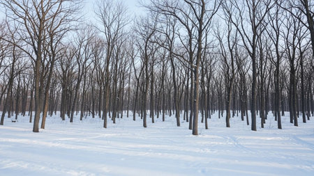 A serene winter scene showing a dense forest of tall leafless trees standing on snow covered ground under a pale sky