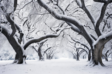 Large, bare oak trees are heavily laden with snow and frost, creating a starkly winter scene with a soft, diffused light.