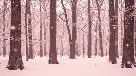 A serene winter forest scene bathed in a soft pink light. Bare deciduous trees stand tall with frosted branches, while delicate snowflakes gently fall through the air. The ground is covered in a blanket of snow, creating a tranquil and peaceful atmosphere. The muted color palette and soft focus evoke a sense of quiet beauty and a dreamy winter wonderland.