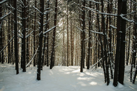 Winter forest landscape. Snow in forest. Cold winter weather. Coniferous forest background. Sunlight through the trees. Sunset landscape. Sunrise sun shining. Warm color nature background.