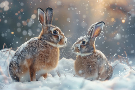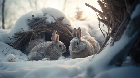 Two hares sitting in the snow during a winter sunset. Peaceful, serene scene.