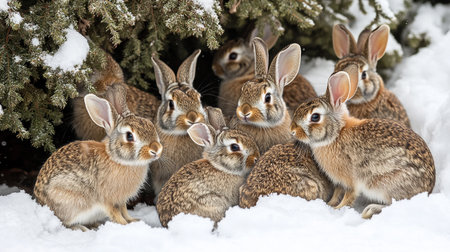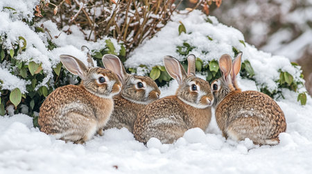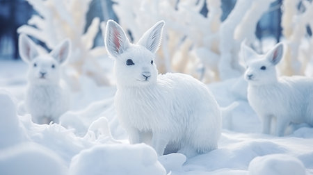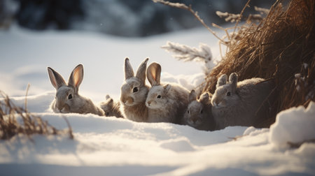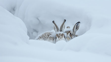 A hare and its kin nestled in a snowdrift, their fur blending seamlessly with the winter white, showcasing nature's camouflage and the subtle beauty of animal families in their natural habitat.