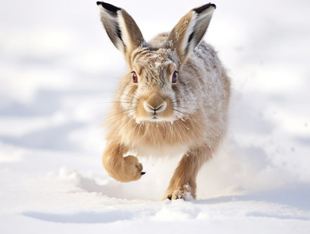 A hare running in the snow on a sunny day in winter