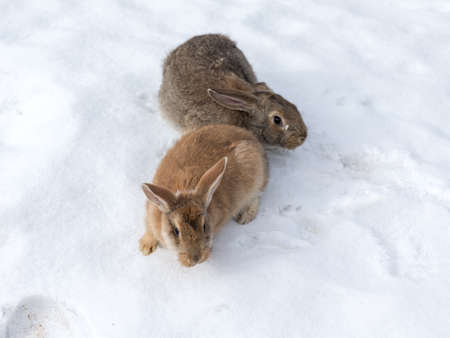 Rabbits on the snow in the winter garden. Cute animals.