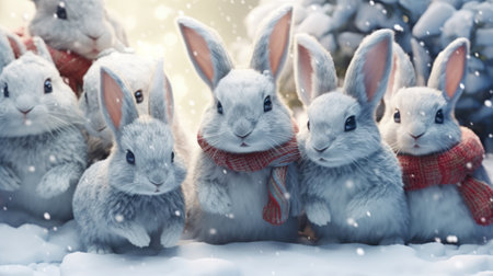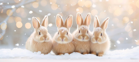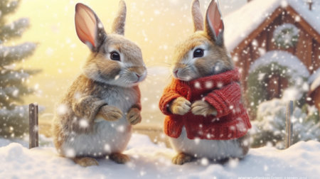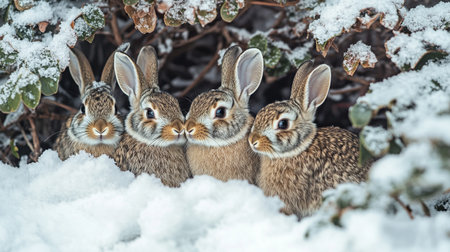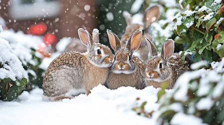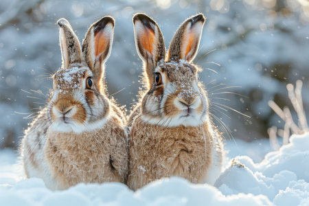 Adorable snow-covered rabbits in winter