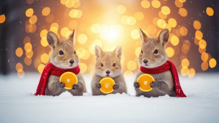 Three cute little rabbits in red knitted scarves and scarves sitting in the snow with orange zest on bokeh background