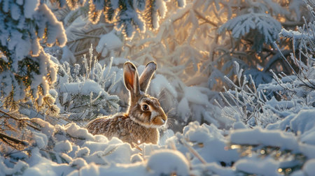 A lone arctic hare sits peacefully in a snow-covered forest at sunrise. The soft golden light illuminates the scene, creating a magical winter wonderland.