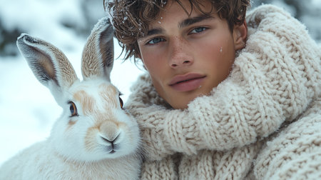 young man with cute rabbit in winter park on snow, closeup