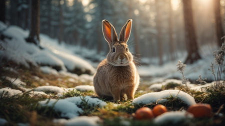Rabbit in winter forest. Easter background. Happy easter.