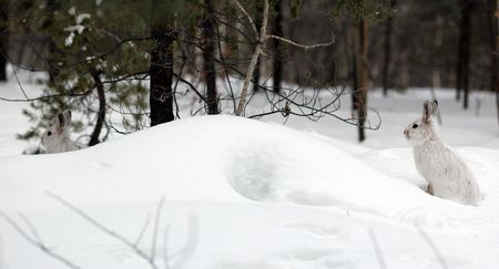 A pair of snowshoe hares camouflaged in the white winter snow, surrounded by barren trees and frosty ground.