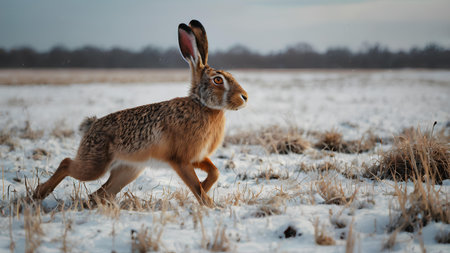 Brown rabbit sitting on snow-covered ground during sunset, highlighting natural habitat and wildlife beauty in serene winter landscape