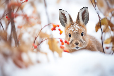 frosted berry bush with curious rabbit underneath