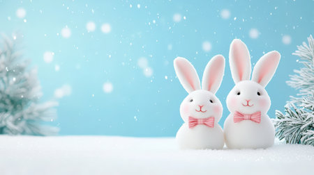 Two charming bunny figurines with pink bows stand on a snowy surface, surrounded by a serene blue backdrop, creating a whimsical winter scene perfect for decorations.