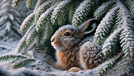 Brown hare finds shelter among pine branches in a snowy winter forest