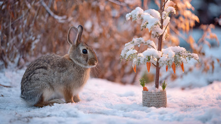 Rabbit and carrot plant in the snow in winter. Cute bunny in winter.