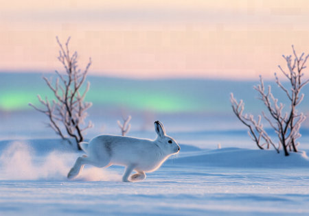 Arctic Hare Running Across a Snowy Tundra at Sunset with a Faint Aurora Borealis