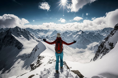 Victorious Summit: A Hiker Embracing Triumph amidst Snowy Peaks
