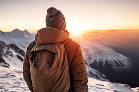 A solitary figure stands on a snowy ridge, back to the camera, gazing at the vibrant sunrise illuminating the majestic, rugged peaks stretching across the horizon