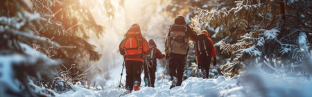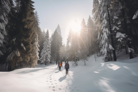 winter sports enthusiasts, snowshoeing through the snow-covered forest, created with generative ai