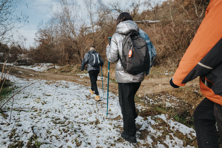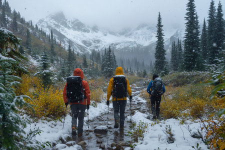 Backpackers hiking in snowy mountain path during autumn, enjoying the adventure