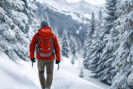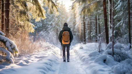 Male hiker, full body, view from behind, walking through a snowy forest - Generative AI