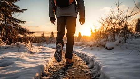 A lone hiker walks a snowy mountain path at sunset. Serenity and adventure in the vast winter landscape.