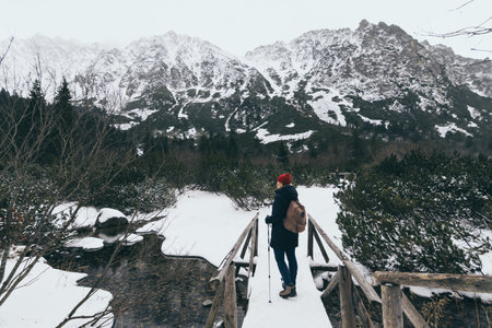 Woman trekking in snowy High Tatra mountains in winter close to Popradske Pleso, Slovakia